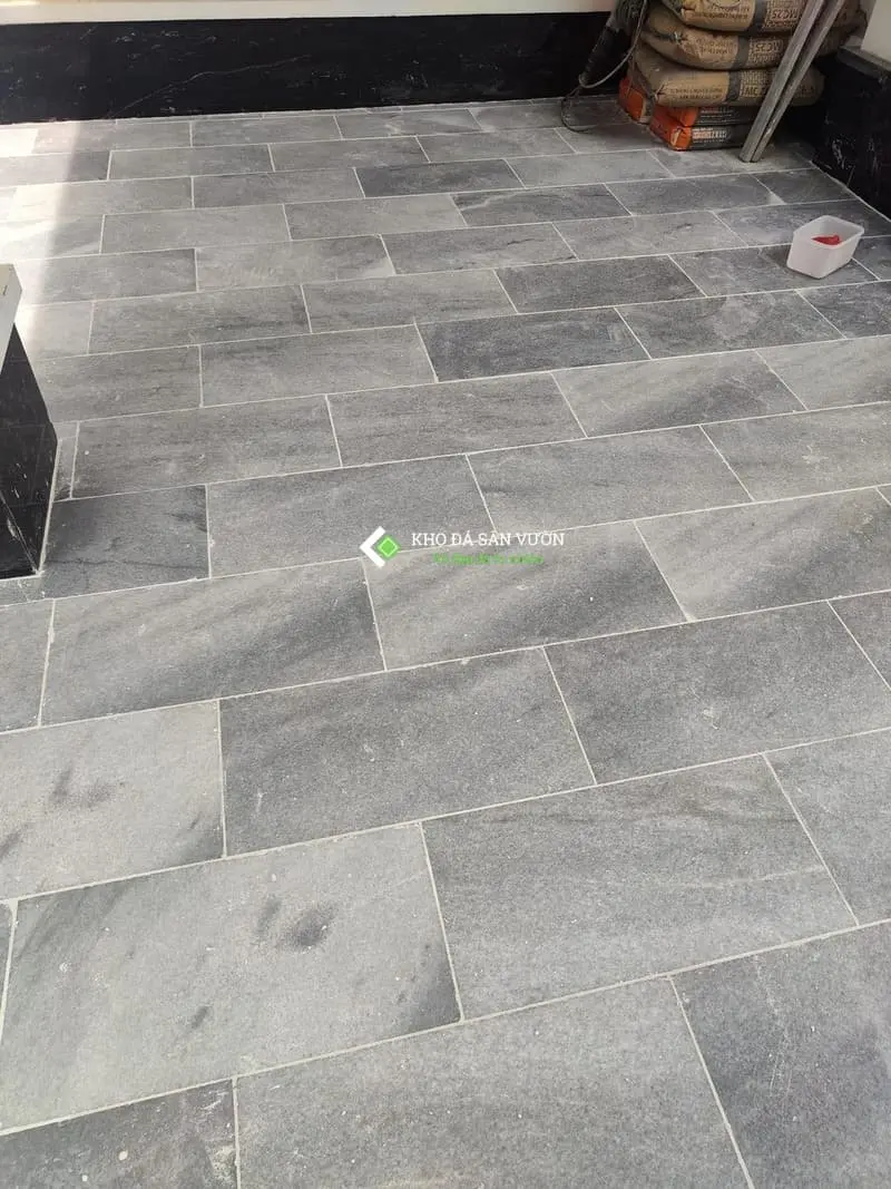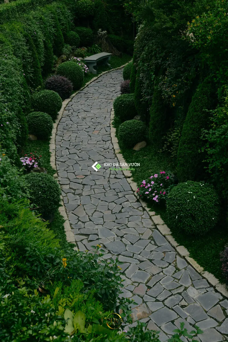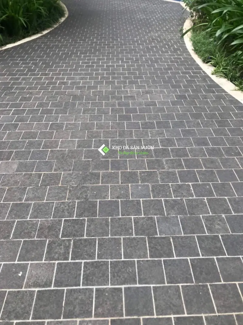 Lối đi bộ và sân chơi: có thể dùng các dòng đá limestone như đá xanh đen, đá xanh rêu hoặc các mẫu đá ong xám, đá sọc dưa. Độ dày đá 2cm là đủ.